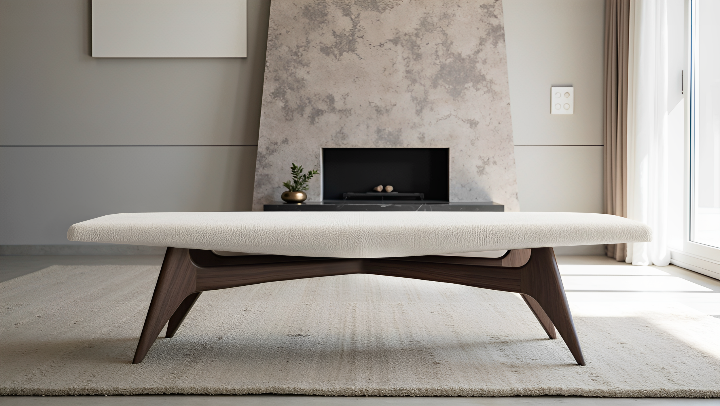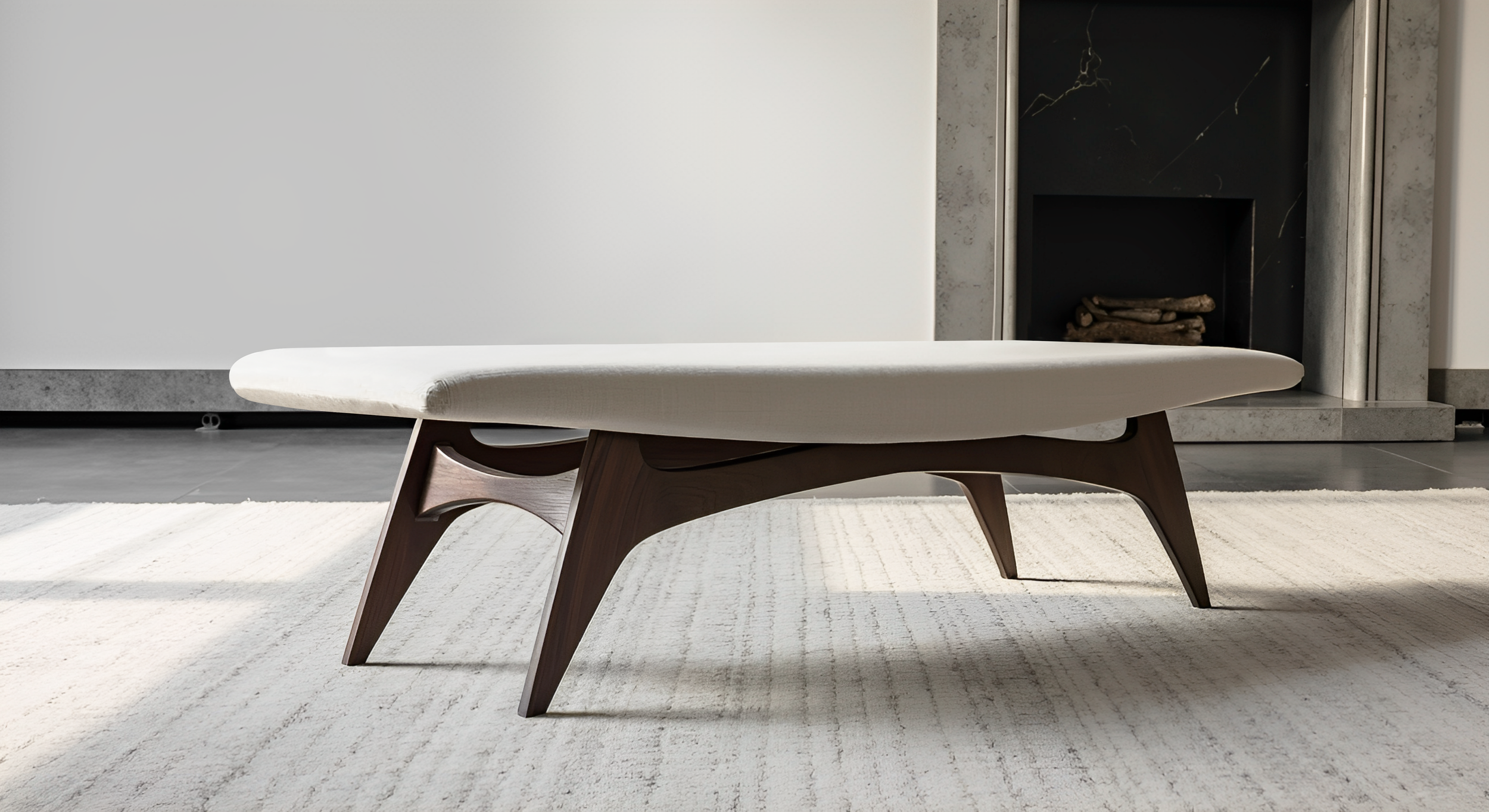 DECLARE introduces the AFFLATUS Bench, a bold piece of furniture designed for those who appreciate sculptural forms. This stunning bench embodies a vision inspired by mid-century modern design. It is a unique expression that honors unusual aesthetics from decades past. Featuring clean lines and a highly sculpted design, this creation reveals an audacious concept that reflects a thoughtful modernist approach, striking a harmonious balance between minimalist and vibrant curves. Its functionality is enhanced by a stylish seat and a sculptural solid wood base, adding elegance and sophistication.